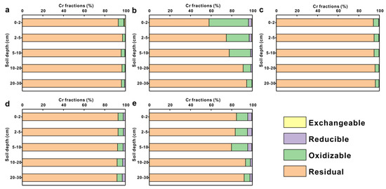 Percentage of exchangeable, reducible, oxidizable, and residual fractions of total Cr in soil profiles under different preservative–treated planks: (a) Background profile; (b) CCA-5; (c) ACQ-3; (d) CA-6; (e) CCA plus CA-3.