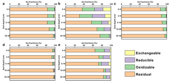 The residual fraction was the main form of As within the background profile, accounting for 82.70–95.86% of the total content. The oxidizable fraction followed with 2.42–15.81%, while the reducible and exchangeable fractions accounted for a small percentage (Figure 8a). The speciation distributions of As in the profiles under the ACQ and CA treatments were similar to those in the background (Figure 8c,d). In contrast, the percentage of non-residual fractions in the profiles under the CCA and CCA plus CA treatments increased significantly (Figure 8a,e). In the soil profile under CCA treatment, 36.63–87.22%, 11.01–27.84%, 1.55–28.11%, and 0.22–17.59% of residual, oxidizable, reducible, and exchangeable fractions were observed, respectively. Detailed information about As content of each fraction in the soil profiles was presented in the Supplementary Materials (Table S7). Overall, the proportion of residual fractions increased with increasing soil depth for all profiles, and the other fractions decreased with increasing depth.