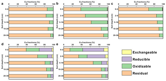 Percentage of exchangeable, reducible, oxidizable, and residual fractions of total Cu in soil profiles under different preservative–treated planks: (a) Background profile; (b) CCA-5; (c) ACQ-3; (d) CA-6; (e) CCA plus CA-3.