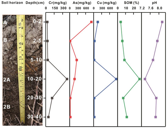 In the SS2 samples, SOM content was positively correlated with the contents of the three elements and reached a significant correlation with Cr and Cu contents (Table 4). It was found that organic matter content was significantly and positively correlated with As and Cr contents, respectively, which was attributed to the fact that organic matter in soils tends to form complexes with heavy metal ions, thus reducing their activity and leading to an increase in soil heavy metal content [66]. Cr, As, and Cu measured in this study exhibited extremely high retention in the surface soils. In contrast, samples collected in areas with sandy soil (average sand content of 95%) contaminated with CCA-treated wood for 5–10 years showed low retention [42]. Usually, Cu is present in a less mobile and biologically effective form in contaminated soils [70]. Only 1–20% of Cu in the soils is bioavailable; however, most Cu is bound to organic matter [71]. Speciation classification studies on Cu in acidic vineyard soils have shown that more than 50% of Cu is organically bound [72]. Therefore, the significant positive correlation between Cr and Cu content and SOM content in the SS2 samples should be due to the formation of complexes between SOM and Cr and Cu, thus reducing bio-effectiveness and mobility and leading to an increase in soil metal content. In the samples of soils at a depth within 0–10 cm, the correlations between metal(loid)s and SOM and soil pH values were not very strong, possibly due to the predominant effect of the extremely high concentration of As, Cr, and Cu in the preservative woods on the corresponding contents in soils.