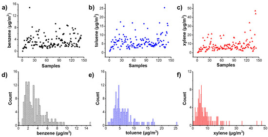 Concentration distributions of (a,d) benzene, (b,e) toluene, and (c,f) xylene in 143 indoor air samples.