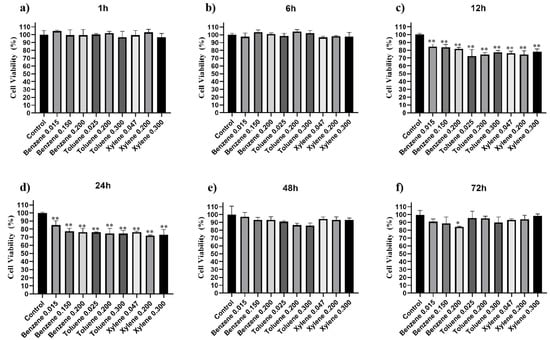 Cell viability test under different concentrations of BTX (see detailed concentrations in Table 2) and different incubation times. All BTX was dissolved in DMSO before added into BEAS-2B cell culture medium. The ratio of DMSO to cell culture medium is 0.05%. * p < 0.05 and ** p < 0.01.