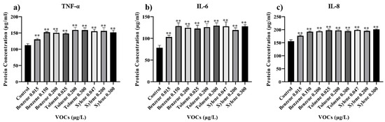 The ELISA test was used to detect the concentrations of (a) tumor necrosis factor-α (TNF-α), (b) interleukin-6 (IL-6), and (c) interleukin-8 (IL-8) in the supernatant of BEAS-2B cells cultured with varying concentrations of BTX. The data were collected after incubating the cells with different concentrations of BTX in the culture medium for 24 h. The ratio of DMSO to cell culture medium is 0.05%. ** p < 0.01.