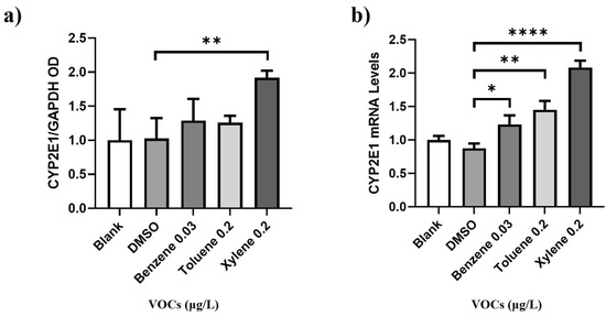 Glyceraldehyde-3-phosphate dehydrogenase (GAPDH), as a kind of house-keeping gene, is one of the enzymes in the glycolysis reaction, and shows a high expression level in almost all tissues. The expression of certain proteins in the same type of cells or tissues is usually constant and not affected by the certain recognition sites contained in it. Therefore, GAPDH is commonly used as an internal reference in quantitative RT-PCR, Western Blot, and other experiments [22]. Previous studies have shown that the toxicity of BTX is due to the formation of highly reactive metabolites that can form adducts and ROS as byproducts. Among other metabolic enzymes, cytochrome P450 2E1 (CYP2E1) is known to play a key role in BTX metabolism [23,24]. To investigate this further, we treated BEAS-2B cells with a limited concentration of BTX, under the current standard, for 24 h and analyzed the expression of CYP2E1 at both the transcriptional and protein levels. The results, as shown in Figure 5, indicate that the expression of CYP2E1 in BEAS-2B cells increased in response to BTX treatment, and with an especially significant increase for xylene treatment, confirming the toxicity of BTX on BEAS-2B cells.