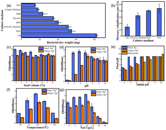 Under the optimum conditions, LB liquid medium containing 10 mg/L Hg2+ and LB liquid medium without Hg2+ were used. The following range of inoculums was used for the test strains: 1%, 2%, 3%, 4%, 5%, 6%, 7%, and 8%, and the OD600nm values were determined after 36 h of incubation at 150 rpm and 30 °C.