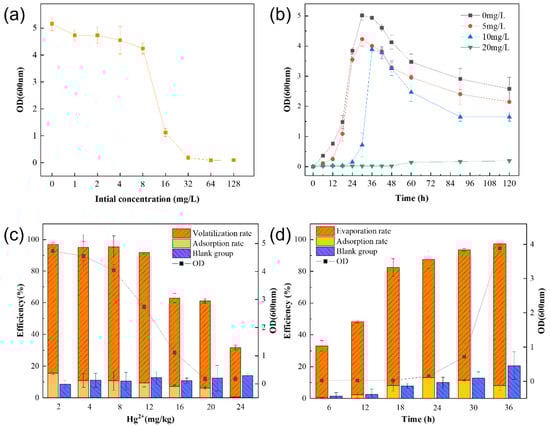 2+ and incubated in a biochemical incubator at 37 °C for 48 h. After the colonies grew on the medium, the concentration of mercuric chloride in the LB solid medium was increased continuously. A high concentration of mercury-tolerant strains was screened by picking and culturing individual colonies on an LB solid medium containing a high mercury concentration.