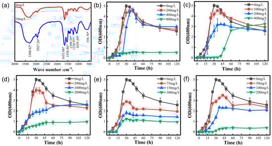 2+. The bacteria were incubated in an LB medium with mercury (10 mg/L) and without mercury for 36 h. The cultures were centrifuged at 8000 rpm for 10 min, the supernatant was discarded, and the organisms were washed three times with phosphate buffer solution. The strains were freeze-dried under a vacuum, and the dried samples were thoroughly mixed with potassium bromide (KBr) powder in an agate mortar (bacterial mass: KBr mass = 1:100), pressed into thin slices using a solid press, and measured using a Fourier infrared spectrometer to record the infrared spectra in the region of 4000–400 cm