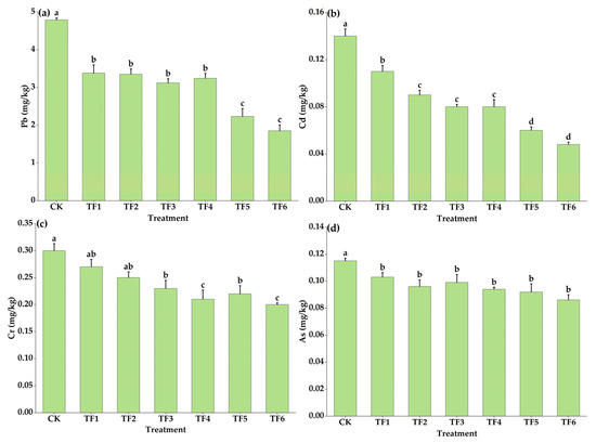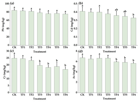 Effects of shellfish amendment and organic fertilizer on soil Pb (a), Cd (b), Cr (c), and As (d). Note: no shellfish amendment or organic fertilizer (CK), shellfish amendment 750 kg/ha + organic fertilizer 3750 kg/ha (TF1), shellfish amendment 750 kg/ha + organic fertilizer 7500 kg/ha (TF2), shellfish amendment 1500 kg/ha + organic fertilizer 3750 kg/ha (TF3), shellfish amendment 1500 kg/ha + organic fertilizer 7500 kg/ha (TF4), shellfish amendment 2250 kg/ha + organic fertilizer 3750 kg/ha (TF5), shellfish amendment 2250 kg/ha + organic fertilizer 7500 kg/ha (TF6). Error bars are means ± standard deviation. Different lowercase letters in the figure indicate significant differences between different treatments (p < 0.05).