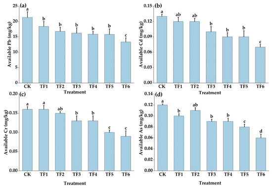As shown in Figure 2a, compared with the CK treatment, each treatment significantly reduced the soil available Pb content. At the same time, with the increase in shellfish amendment and organic fertilizer application, the soil available Pb content gradually decreased. The TF6 treatment had the lowest content of 13.35 mg/kg, which was decreased by 37.44% compared with the CK treatment (p < 0.05). Compared with the available Pb content before the experiment (20.95 mg/kg), the TF6 treatment decreased by 36.28%. After the application of the shellfish amendment and organic fertilizer, compared with the CK treatment, the soil available Cd content decreased by an average of 24.36%, with the TF3, TF4, TF5, and TF6 treatments presenting significant decreases of 23.08%, 30.77%, 30.65%, and 46.15%, respectively (p < 0.05). The content of available Cd in the soil decreased by 28.57% after the experiment. The content of available Cr in the soil was 0.09 mg/kg in the TF6 treatment, which was significantly lower than that in the CK treatment by 43.75%. Compared with the CK treatment, the soil available As content of the TF1, TF3, TF4, TF5, and TF6 treatments decreased by 16.67%, 25.00%, 25.64%, 33.33%, and 50.00%, respectively (p < 0.05).