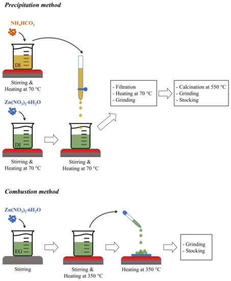 ZnO NPs were synthesized via the precipitation process by mixing a 0.2 M aqueous solution of Zn(NO3)2·6H2O with a 0.4 M aqueous solution of NH4HCO3 in DI water. The starting aqueous solutions were separately prepared, stirred, and heated at 70 °C for 1 h. Then, the NH4HCO3 solution was added dropwise into the Zn(NO3)2·6H2O solution at a dropping rate of 2 mL/min [23]. The mixed solution was heated and stirred for an additional hour and then cooled down. Afterward, the obtained white product was filtered, heated at 70 °C for 3 h, and ground. The obtained product was then calcined at 550 °C for 6 h and ground again to obtain “ZnO precipitation”. For the combustion process, a 1 M aqueous solution of Zn(NO3)2·6H2O was prepared by dissolving the compound in 20 mL of ethylene glycol (EG) and stirring for 1 h at room temperature [11]. The resulting aqueous solution was then heated to 350 °C for 20 min on a hotplate. Meanwhile, cleaned glass slides were heated to the same temperature on another hotplate to serve as substrates for the combustion process. The Zn(NO3)2·6H2O solution was then dropped onto the heated substrates and allowed to undergo combustion for 20 min, followed by cooling down to room temperature. The products of the combustion were scratched from the substrates. The resulting material was identified as “ZnO combustion” after being ground. The precipitation and combustion methods are briefly illustrated in Figure 1.