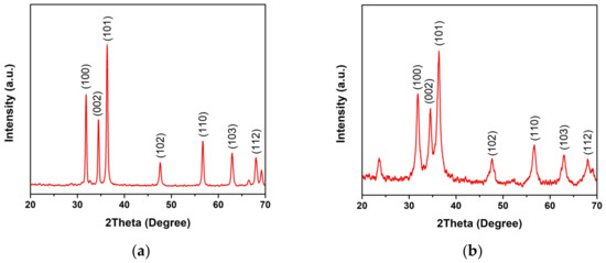 The crystal structure determined by XRD patterns is presented in Figure 5. The XRD patterns are well-matched with standard JCPDS no. 36-1451 [24,25], which indicates the hexagonal wurtzite structure of ZnO. The appeared additional peak at 2θ~23.5° for ZnO combustion can refer to the orthorhombic phase of Zn(OH)2 (JCPDS no. 01-071-2215) caused by the incomplete reaction [11]. The XRD peaks for ZnO precipitation were narrower than those for ZnO combustion, indicating that the crystal size of ZnO precipitation is larger than that of the ZnO combustion. The crystal size (D) was calculated using the Scherrer equation (Equation (1)) [26,27,28]: