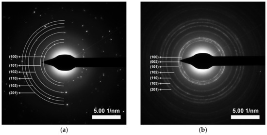 where k and λ are the shape factor of XRD measurement (0.89) and the wavelength of the X-ray source (1.5406 Å), respectively. The β and θ are the full width at half maximum (FWHM) and the diffraction angle for each plane, respectively. The crystal sizes calculated from the three major peaks of (100), (002), and (101) planes were 45.5 ± 10.0 and 10.4 ± 2.6 nm for ZnO precipitation and ZnO combustion, respectively, in agreement with the SEM results. The larger crystal size for ZnO precipitation reflects better crystallization in comparison with ZnO combustion because the precipitation process provides a longer chemical reaction time for crystallization. On the other hand, the reaction can be limited by the short duration of the combustion process. The SAED patterns (Figure 6) exhibited similar ring-like patterns for ZnO precipitation and ZnO combustion, indicating polycrystalline structures due to random phase growth [23].