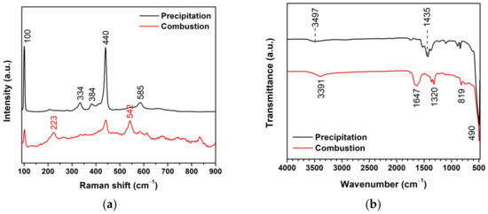 Figure 7a depicts the Raman shift for vibrational analysis of ZnO NPs. The ZnO NPs revealed dominant peaks at 100 and 440 cm−1, which assigned the E2 (low) and E2 (high) modes, respectively [29,30]. The E2 (low) vibration represented the zinc crystal lattice in ZnO, while the E2 (high) vibration represented the oxygen vibration. The peaks at 334, 384, 542, and 585 cm−1 were assigned to the E2 (high)–E2 (low), A1 (TO), A1 (LO), and E1 (LO) modes, respectively [31]. The peak at 223 could be assigned to 2TA or 2E2 (low) modes. [30,32]. These peaks indicate the disordered structures for both ZnO NPs prepared by precipitation and combustion. Moreover, the E2(low) and E2(high) modes show low intensity compared with the ZnO precipitation. These behaviors suggest the presence of oxygen defects in the ZnO combustion. In Figure 7b, FTIR spectra in the range of 4000–450 cm−1 were analyzed to investigate functional groups of the ZnO NPs. The peaks at 490 cm−1 contributed to the ZnO structure, due to the Zn-O vibration [33]. The peaks at 819 and 1647 cm−1 corresponded to C=O stretching [11]. The peaks at 1320 and 1435 cm−1 corresponded to C-O stretching and C-H blending, respectively [11]. The peaks at 3391 and 3497 cm−1 were assigned to the O-H stretching. The appearance of these peaks implies the presence of residuals.