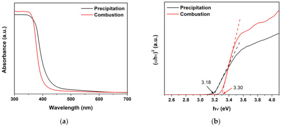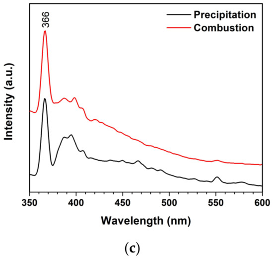 where α, h, ν, and A are the absorption coefficient, Planck’s constant, frequency, and constant, respectively. The (αhν)2 vs. hν curve, Figure 8b, was used to calculate the Eg value. Eg values of the ZnO precipitation and the ZnO combustion are 3.18 and 3.30 eV, respectively. The difference in Eg for ZnO precipitation and ZnO combustion might be due to structural disorders, chemical defects, and impurities. The Eg values correspond to the range of the UV region, which indicates that these ZnO NPs can be utilized as photocatalysts under UV irradiation. Note that the lower Eg for the ZnO precipitation refers to the fact that it can be excited with lower incident energy in comparison with the ZnO combustion. The fluorescence spectra of ZnO NPs excited at 325 nm are shown in Figure 8c. The ZnO precipitation and the ZnO combustion present a similar emission peak in the UV region at 366 nm. The behavior might be electron-hole recombination, referring to the nature of ZnO. However, surface defects are detected according to the minor broad peaks at around 387–407 nm.