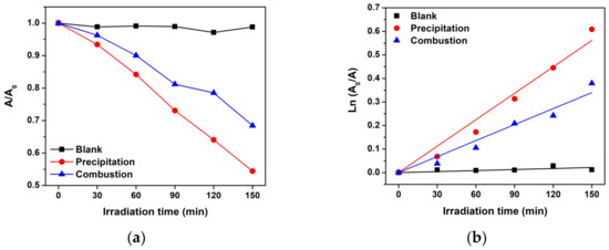 As shown in Figure 10a, the interval to the initial absorbance (A/A0) ratio of MB was plotted to observe the change in MB after photocatalytic activity. When compared to ZnO combustion, the A/A0 of MB had a significantly lower value for ZnO precipitation. For a better comparison, the apparent degradation rate constant (kapp) was analyzed using Equation (3) [9,28]: