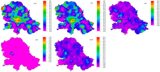 Depending on the use of land, the concentration of DEP ranges from 0.0015 to 39 mg/kg. The mean ± SD (range) concentrations for DEP in soil samples in this research was 0.77 ± 1.87 (0.01–25.12 mg/kg). The highest concentrations of DEP were measured in soil samples from the municipalities of Alibunar and Plandište in South Banat District and the municipalities of Kula and Sombor in West Bačka District (Figure 3).