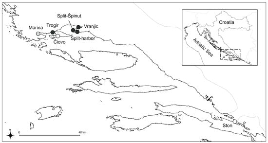 Map indicating sampling sites. Lowly polluted sites (in white): Čiovo and Ston; intermediately polluted site (in grey): Marina; highly polluted sites (in black): Trogir, Vranjic, Split-Špinut, and Split-harbour.