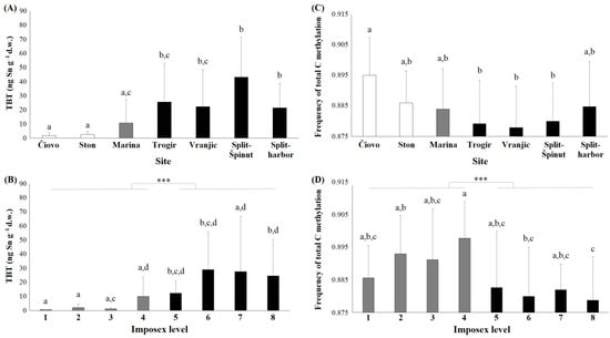 TBT concentration and DNA methylation across populations and imposex levels of banded murex (H. trunculus) collected in the Adriatic Sea. TBT concentrations (ng Sn g−1 dry weight) measured in whole H. trunculus tissue: (A) TBT per sampling site; (B) TBT per imposex level, mean ± SD. Letters relate to the significance between populations/groups (Mann–Whitney U test, p < 0.05), and stars (***) denote the significance between low (1–4) and high (5–8) imposex levels (Mann–Whitney U test, p < 0.001). Frequency of DNA methylation: (C) per sampling site; (D) per females exhibiting specific imposex level (from normal females denoted as level 1 to females with the highest imposex denoted as level 8). Letters relate to the significance between populations/groups (ANOVA and Tukey’s post hoc test, p < 0.05), and stars (***) denote the significance between low (1–4) and high (5–8) imposex levels (ANOVA and Tukey’s post hoc test, p < 0.001). (A,C) White bars indicate sites of low pollution pressure, grey bars indicate sites of intermediate pollution pressure, and black bars indicate sites of high pollution pressure (B,D) Grey bars indicate low (1–4) and black bars indicate high (5–8) imposex levels.