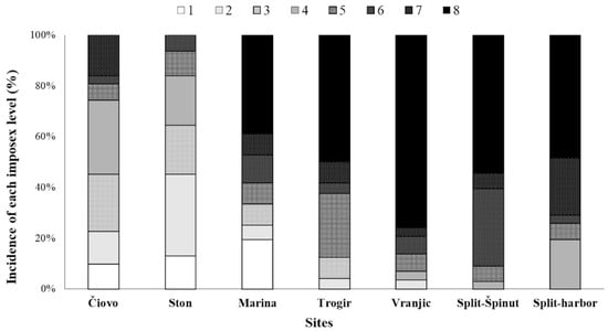 At the sites with a low pollution intensity, Čiovo and Ston, the majority of females (74.2% and 83.9%, respectively) had imposex levels in the lower range (1–4) and no individuals with an imposex level of 8 were recorded. At the intermediately polluted site of Marina, 33.3% of females had lower imposex levels (1–4) and 38.9% of females had the highest imposex level (8). At the four highly polluted sites, none of the examined females had the lowest imposex level (1) and between 80.6% and 97% of females had higher imposex levels (5–8) (Figure 3).