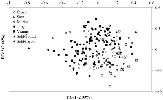 Principal coordinate analysis of epigenetic (MSL) fragments obtained from banded murex (H. trunculus) individuals collected in the Adriatic Sea. Colour codes relate to site pollution intensity: white—lowly polluted sites (Čiovo and Ston); grey—intermediately polluted sites (Marina); black—highly polluted sites (Trogir, Vranjic, Split-Špinut, and Split-harbour). In PCo1, lowly polluted sites were significantly separated from intermediately and highly polluted sites. In PCo2, lowly and intermediately polluted sites were significantly separated from highly polluted sites; ANOVA and Tukey’s post hoc test, p ≤ 0.05.