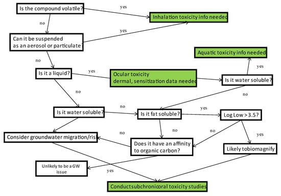 Example flow chart using chemical/physical properties to infer exposure pathways and toxicity data needed to address risk potential. Green boxes indicate data/studies required.