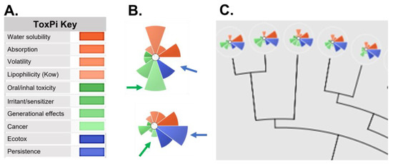 ToxPi footprint of two constituents. (A) The endpoints of interest are sorted into 10 categories that represent human, ecological, and environmental properties of concern. (B) Two chemicals evaluated with ToxPi that demonstrate different patterns of toxicity. Green arrows show high concern for cancer (top) compared with low concern (bottom). Conversely, the top compound has low concern for persistence, while the bottom compound is scored as persistent (blue arrows). (C) ToxPi also generates a dendrogram of the evaluated compounds so that similarly scored compounds are clustered.