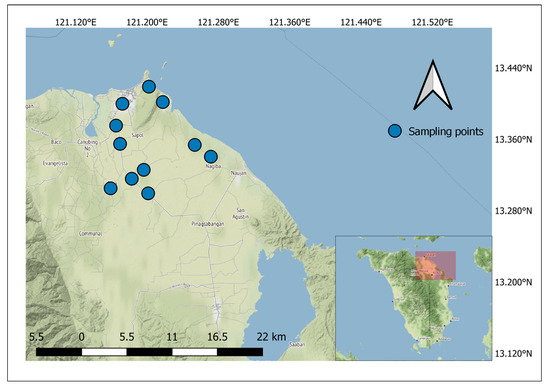 Eleven (11) samples of Tilapia spp. were collected from vendors in the barangays of Calapan City, as described by the global positioning system (GPS) plots in Figure 1. These are the barangays that had available Tilapia spp. that could spatially represent Calapan City. This city is about 73.28 nautical miles (about 5 h of travel by land and sea) from Manila, the Philippines’ capital city. Barangays are the most basic territorial, administrative, and local government units in the Philippines [21]. In addition, GPS coordinates for collection sites were recorded to map the source or origin of fish samples. The eleven (11) barangays from which the fish samples were collected were: Bayanan II, Biga, Comunal, Lalud, Managpi, Nag-iba I, Nag-iba II, Panggalaan, Parang, Sta. Isabel, and Suqui.