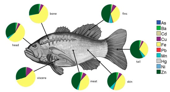 - Canli, M.; Atli, G. The relationships between heavy metal (Cd, Cr, Cu, Fe, Pb, Zn) levels and the size of six Mediterranean fish species. Environ. Pollut. 2003, 121, 129–136. [Google Scholar] [CrossRef]
