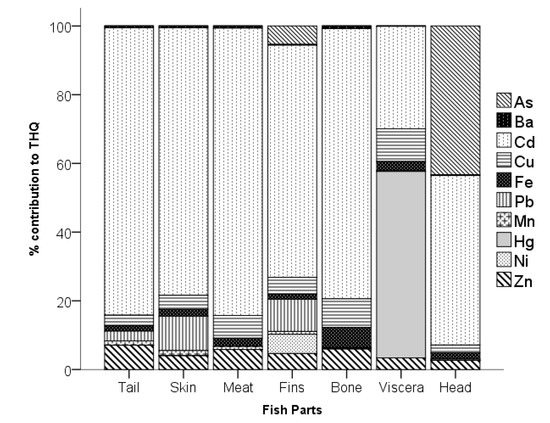 To understand the overall non-carcinogenic health risks due to the intake of various parts of tilapia, the total target hazard quotient (TTHQ) was calculated following Equation (3) [21].