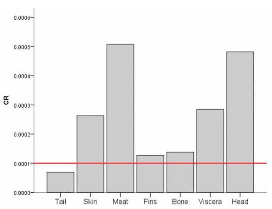 The carcinogenic risk (CR) of consuming various parts of tilapia contaminated with As, Cd, Pb, and Ni was assessed. As shown in Figure 5, except for the tail, all of the CR through the consumption of several parts of tilapia exceeded the threshold value of 1 × 10−4, implying that cancer risk was highly probable [51]. The highest CR was recorded in the meat, which was approximately 0.00051. This was followed by the head at 0.00048. The sequence of CR in various parts of tilapia followed the order of meat > head > viscera > skin > bone > fins > tail.