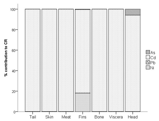 Figure 6 shows the % contribution of each HM identified as a carcinogen to the CR. More than 99% of the CR in the tail was contributed by Cd. Similarly, the Cd contributed 99.94%, 100%, 81.40%, 100%, 100%, and 94.10% to the CR in the skin, meat, fins, bone, viscera, and head, respectively, of tilapia. It also contributed 5.90% to the CR in the head, while Ni contributed 18.09% to the CR in the fins.
