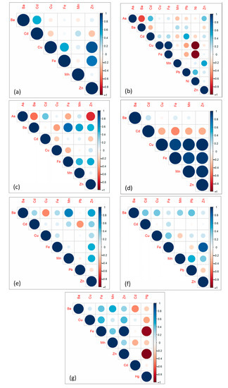 Correlogram of HMs in the (a) bone, (b) fins, (c) head, (d) meat, (e) skin, (f) tail, and (g) viscera of Tilapia spp.