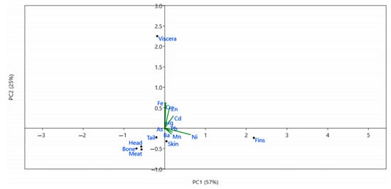 Furthermore, PCA was carried out to evaluate if the sources of HM contamination in tilapia are either due to anthropogenic or natural causes [57]. Principal component (PC) 1 explained 57.23% of the total variance and exhibited an eigenvalue of 7.13 (Figure 8). Ni dominated PC1 with a loading of 0.8684. Similarly, PC2 explained 24.81% of the total variance with an eigenvalue of 3.09. Cu and Fe dominated PC2 with loadings of 0.56193 and 0.5651, respectively. PC3, on the other hand, has an eigenvalue of 2.05 and explained 16.46% of the total variance. PC3 was dominated by Ba and Mn with loadings of 0.6399 and 0.5392, respectively.