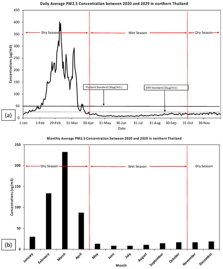 (a) Daily and (b) monthly means of the PM2.5 concentrations in northern Thailand during 2020–2029.