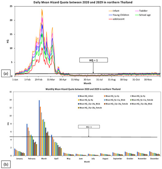 (a) Daily means of the HQ related to PM2.5 concentrations in the age-related development period and (b) the monthly means of the HQ related to PM2.5 concentrations in specific groups of ages in children in northern Thailand during 2020–2029 (black line is HQ = 1).