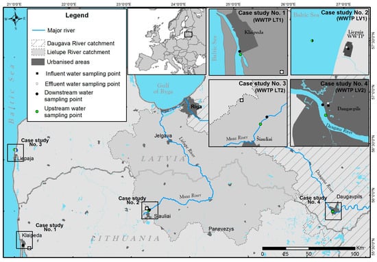 In Latvia and Lithuania, a comprehensive sampling campaign was conducted in July and December 2021 to evaluate the water quality in various locations within each city. In Daugavpils and Liepaja (Latvia) and Klaipeda and Siauliai (Lithuania), a total of 32 water samples were collected from four different sites in each city, including influent, effluent, upstream, and downstream locations (Lithuania). Before and after treatment, influent (n = 8) and effluent (n = 8) samples were collected at each sampling site. Following wastewater treatment, 16 samples of background surface water from upstream (n = 8) and downstream (n = 8) points were collected at a distance of 500 m from the discharge point. Notably, the upstream and downstream samples (SLV3/WLV3, SLV4/WLV4) of Liepaja were collected in the Baltic Sea, above the wastewater discharge point, where brackish water is present. Indeed, four samples were collected from each city in July and December. Figure 1 and Table S1 provide additional information on sampling locations and methods.
