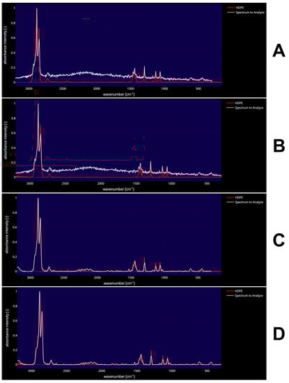 High-Density Polyethylene (HDPE) micro-Raman spectrum comparisons: (A) upstream in Klaipeda; (B) wastewater influent in Klaipeda; (C) wastewater effluent in Klaipeda; and (D) downstream in Klaipeda.