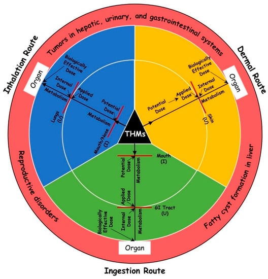 - Basu, M.; Gupta, S.K.; Singh, G.; Mukhopadhyay, U. Multi-Route Risk Assessment from Trihalomethanes in Drinking Water Supplies. Environ. Monit. Assess. 2011, 178, 121–134. [Google Scholar] [CrossRef] [PubMed]