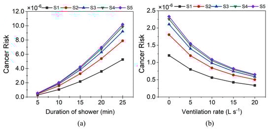 3.5. Effect of Ventilation and Shower Duration on Cancer Risk