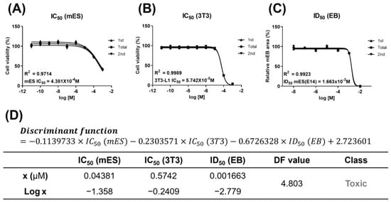 When treated with D5, the cell viability of the two cell lines, mES and 3T3-L1, had IC50 values of 0.04381 μM (mES) and 0.5742 μM (3T3), respectively (Figure 1A–D). In addition, the half inhibitory concentration of the EB size, ID50, was 0.001663 μM (Figure 1C,D). A value of 4.803 was obtained by substituting this derived value into the previously developed discriminant function (Figure 1D). D5 had developmental toxicity because the discriminant function score was higher than the reference value of −0.667.