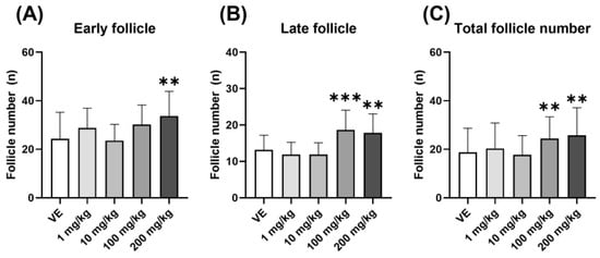 Number of follicles in the ovary of rats exposed to D5. The comparison of the number of ovary follicles in the two stages and the total number of ovary follicles were confirmed: (A) number of early follicles including primordial follicle, primary follicle, and secondary follicle; (B) number of late follicles including antral follicle and preovulation follicle; (C) the total number of follicles including early follicle and late follicle. The values are expressed as means ± SD. ** p < 0.01 and *** p < 0.001 vs. vehicle. VE—vehicle, N = 9~10.