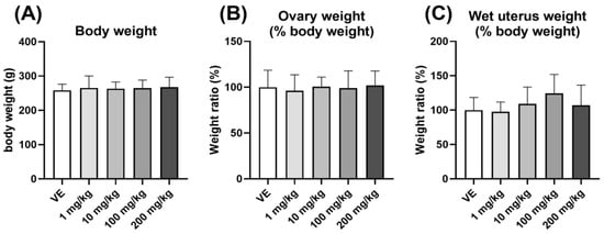 The body weight and organ weight of rats exposed to D5. (A) Body weights of rats; (B) ratio of ovary weight to body weight; (C) ratio of uterus weight to body weight. The values are expressed as means ± SD. VE—vehicle, N = 9~10.