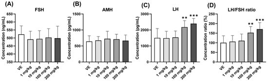 Changes in the concentration of the gonadotropin hormone and the anti-müllerian hormone in the serum. Confirmation of hormones in the serum of rats exposed to D5 for four weeks using ELSIA: (A) FSH concentration in serum; (B) AMH concentration in serum; (C) LH concentration in serum; (D) concentration ratio of LH and FSH in serum. The values are expressed as means ± SD. ** p < 0.01 and *** p < 0.001 vs. vehicle. VE—vehicle, N = 9~10.