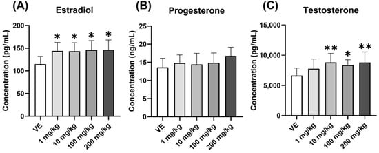 Changes in the concentration of steroid hormone in the serum. Confirmation of hormones in the serum of rats exposed to D5 for four weeks using ELSIA: (A) Estradiol concentration in serum; (B) progesterone concentration in serum; (C) testosterone concentration in serum. The values are expressed as means ± SD. * p < 0.05 and ** p < 0.01 vs. vehicle. VE—vehicle, N = 9~10.