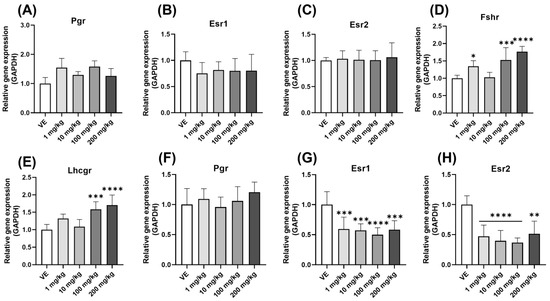 Changes in steroid hormone receptor expression by D5 exposure. Gene expression was confirmed using qPCR in the ovary and uterus of rats exposed to D5 for four weeks: (A) Pgr expression level in the ovary; (B) Esr1 expression level in the ovary; (C) Esr2 expression level in the ovary; (D) Fshr expression level in the ovary; (E) Lhcgr expression level in the ovary; (F) Pgr expression level in the uterus; (G) Esr1 expression level in the uterus; (H) expression level of Esr2 in the uterus. The values are expressed as means ± SD. * p < 0.05, ** p < 0.01, *** p < 0.001 and **** p < 0.0001 vs. vehicle. VE—vehicle; Fshr—follicle-stimulating hormone receptor, Lhcgr—luteinizing hormone/choriogonadotropin receptor; N = 9~10.