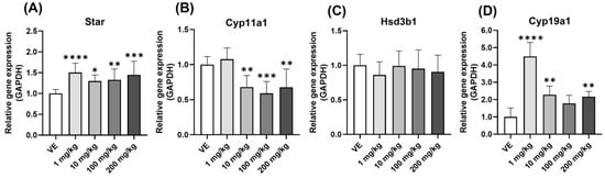 Changes in the expression level of ovary steroid hormone formation upon exposure to D5. Gene expression confirmed by qPCR in the ovary of rats exposed to D5 for four weeks: (A) Star expression level; (B) Cyp11a1 expression level; (C) Hsd3b1 expression level; (D) Cyp19a1 expression level. The values are expressed as means ± SD. * p < 0.05, ** p < 0.01, *** p < 0.001 and **** p < 0.0001 vs. vehicle. VE—vehicle, N = 9~10.