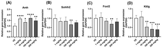 Changes in the expression level of genes involved in ovarian follicle formation when exposed to D5. Gene expression confirmed by qPCR in the ovary of rats exposed to D5 for four weeks: (A) Amh expression level; (B) Sohlh2 expression level; (C) Foxl2 expression level; (D) Kitlg expression level. The values are expressed as means ± SD. * p < 0.05, ** p < 0.01, *** p < 0.001 and **** p < 0.0001 vs. vehicle. VE—vehicle, N = 9~10.
