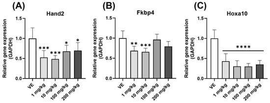 Changes in the expression levels of genes associated with implantation in the uterus when exposed to D5. Gene expression confirmed by qPCR in the uterus of rats exposed to D5 for four weeks: (A) Hand2 expression level; (B) Fkbp4 expression level; (C) Hoxa10 expression level. The values are expressed as means ± SD. * p < 0.05, ** p < 0.01, *** p < 0.001 and **** p < 0.0001 vs. vehicle. VE—vehicle, N = 9~10.