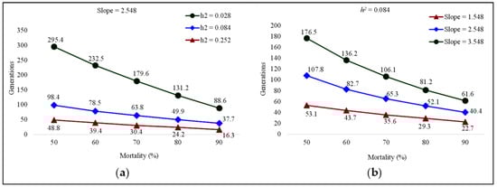 Effect of realized heritability (h2) (a) and slope (b) on the number of generations of FAW required for a 10-fold increase in LC50 of fluxametamide at different selection intensities (i).