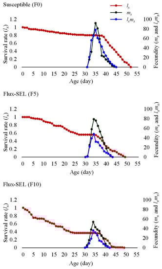 Age-specific survival rate (lx), fecundity (mx), and maternity (lxmx) of FAW in F0, F5, and F10 generations selected with fluxametamide.